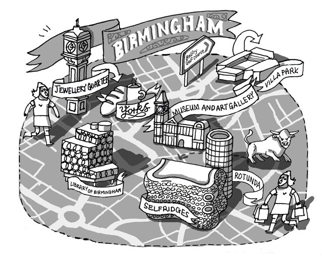 A map of Birmingham, UK for Conference & Incentive Travel magazine for their feature "48 Hours in Birmingham", showing some of the visitor attractions of the city including the renowned Selfridges building, the newly renovated library and the famous Jewellery Quarter