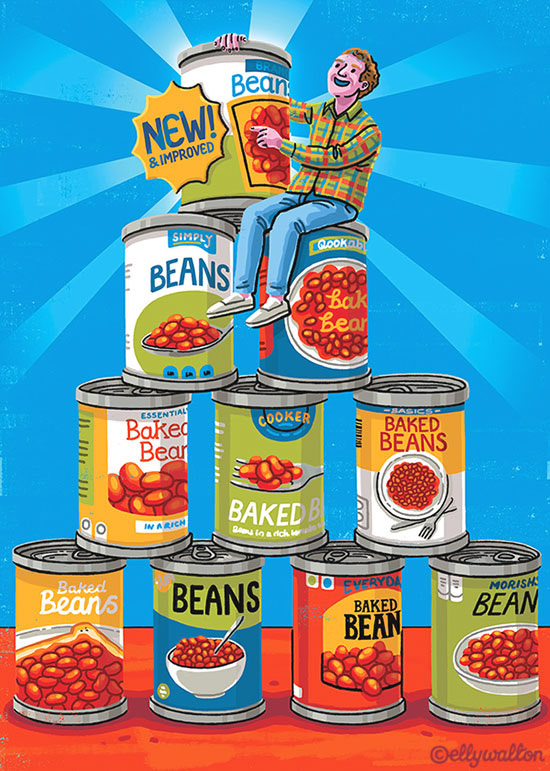 August '22 - Reader's Digest UK, illustration for the regular "It's a Mann's World" column, Olly Mann talks about how he loves to try out the latest products and find his favourite!
