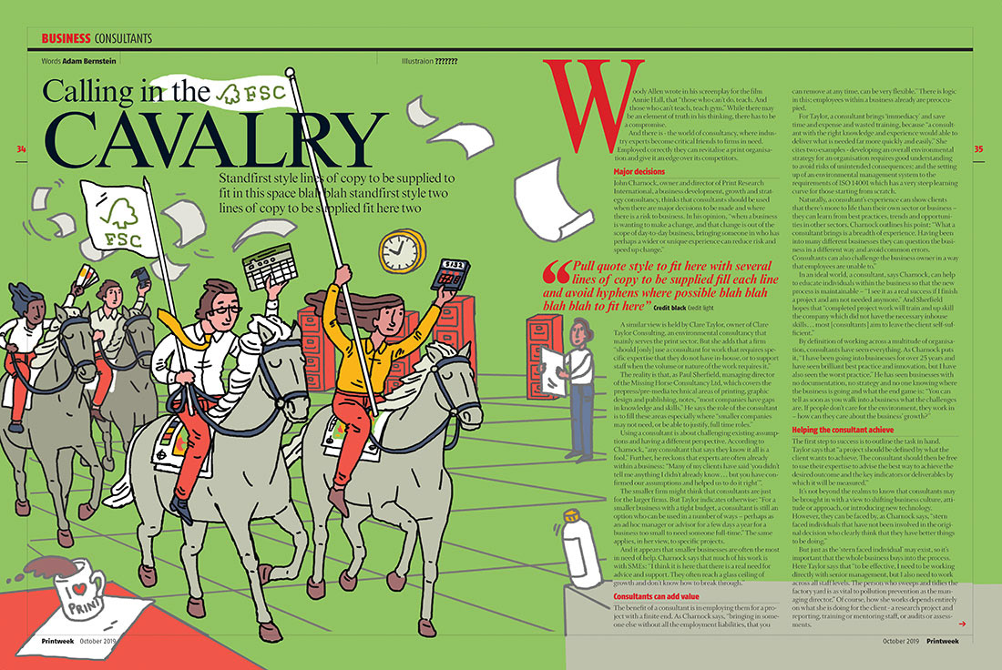 Print Week magazine asked me to illustrate this feature story on bringing in specialist talent or consultants to help with tricky print problems. Playing on the feature headline, here I've shown people riding through an office on horses!
